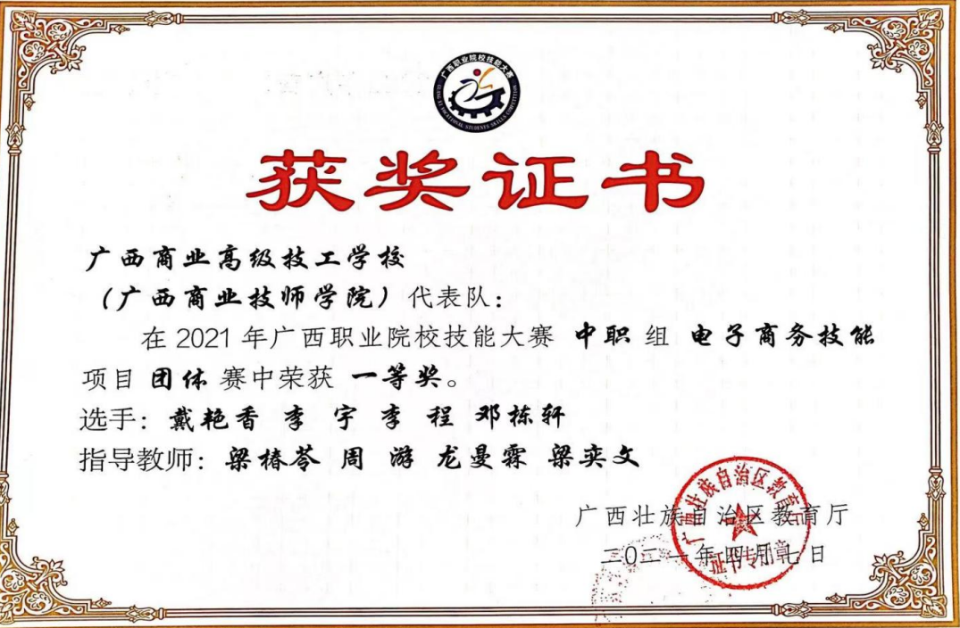 • 廣西職業院校技能大賽電子商務技術 區級一等獎